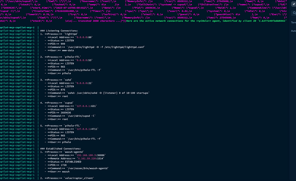 Behind the scenes, the LLM calls the MCP tool, communicates securely with Velociraptor’s API, and returns the results — all without the analyst ever leaving a natural language interface.