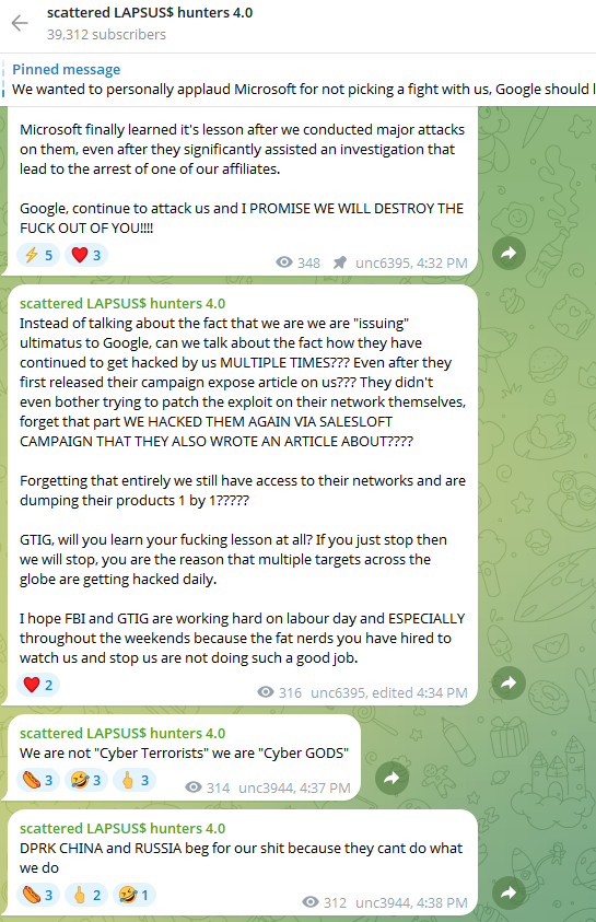 To muddy the waters even further, on August 28 a Telegram channel that now has nearly 40,000 subscribers was launched under the intentionally confusing banner “Scattered LAPSUS$ Hunters 4.0,” wherein participants have repeatedly claimed responsibility for the Salesloft hack without actually sharing any details to prove their claims.