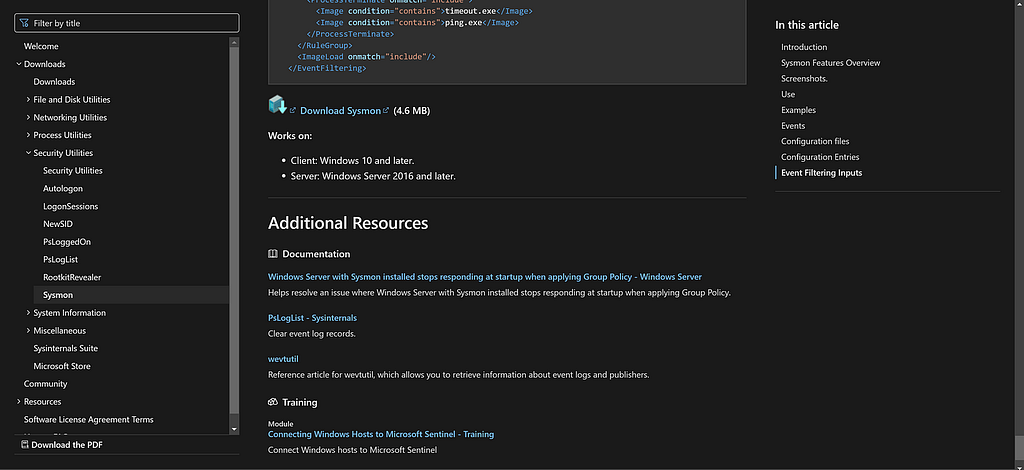 - Download Sysmon from Microsoft Sysinternals. Scroll to the bottom and download the zip file.