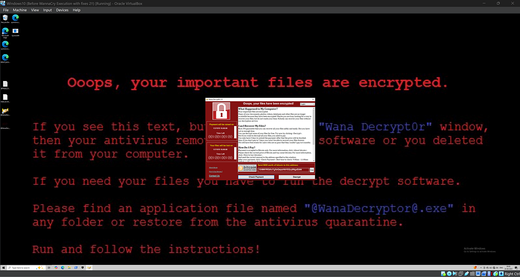 Double click the executable file in theZoo folder. Give it sometime and you should see the following screen. If you notice carefully then there are some files with the extension “.WNCRY”. This means that the VM has been infected by WannaCry Ransomware.