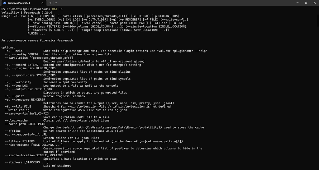 Let’s see the help menu for Volatility to see what type of operations we can perform