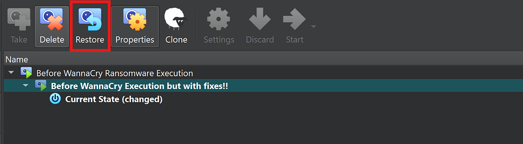 Taking a snapshot is super important step as it will bring our VM back to its original state as it was before after the execution following the NIST SP 800–61 for IR (Incident Response process). To take one, click the Take button: