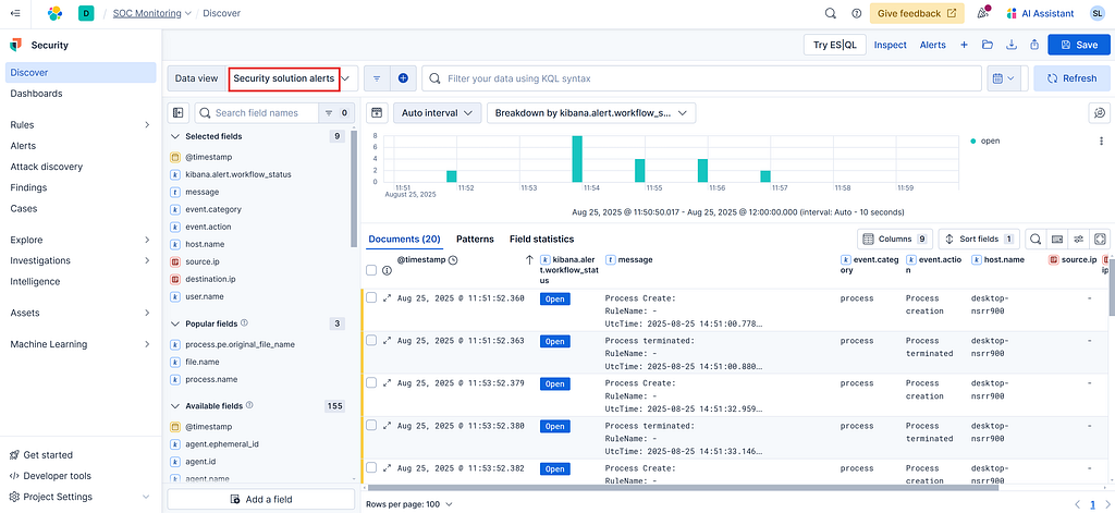 After this is done, go to your Elastic Security dashboard and head over to the Discover tab, and click on “*logs”. This is called an index, and you can assume it as a table that stores all different types of logs.
