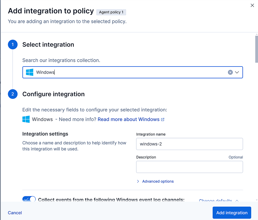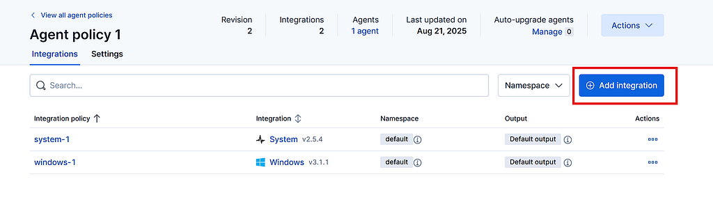 7 . Click on Agent Policies -> click on the current policy that you have and then click on add integration.