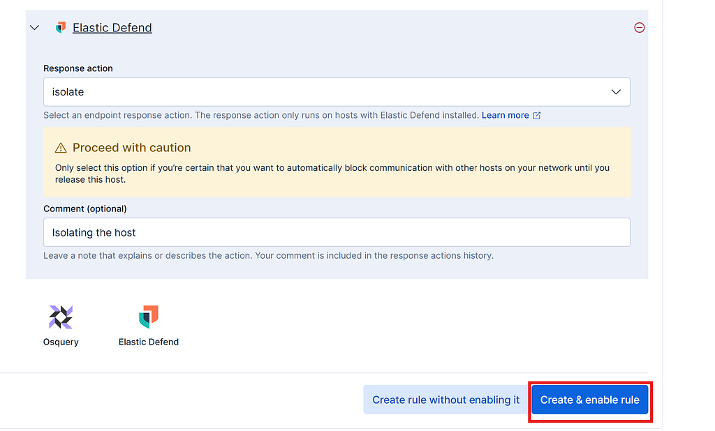 Now for the next step click Elastic Defend under rule actions and response action as isolate. Click on create and enable rule: