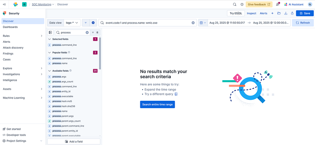 Now the logs should have been forwared to your SIEM. Enter a KQL query for a known malicious process that you know is spawned by running the WannaCry ransomware. Here is my sample KQL query: