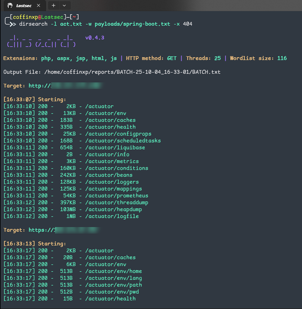 dirsearch -l target.txt -w /Seclist/Discovery/Web-Content/spring-boot.txt -x 404 -o output.txt
