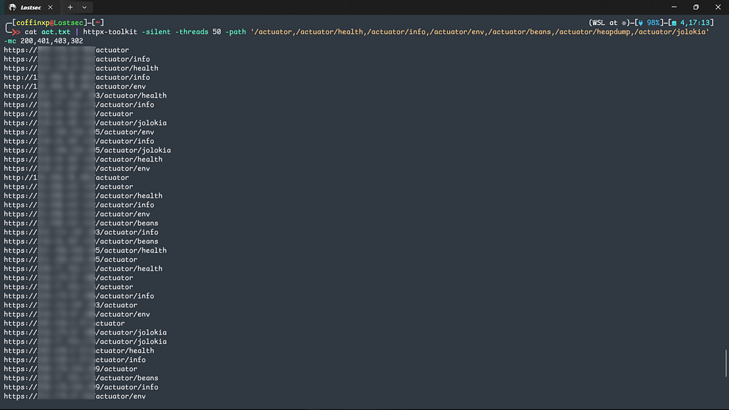 Once I have a list of potential targets, the next step is to verify the presence of Actuator endpoints. To do this, I use a combination of tools to fuzz and probe for common paths.