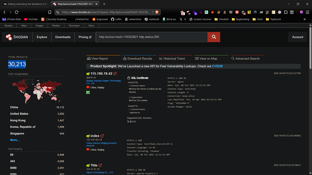 Internet‑wide scanners such as Shodan accelerate reconnaissance. I often fingerprint Spring Boot apps by matching the default favicon hash. You can use a dork like these in Shodan to find potential targets within a specific organization: