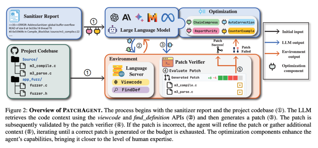 它以 Sanitizer 报告(如 ASAN report)和项目代码库作为输入。智能体首先分析Sanitizer 报告,并与项目代码库交互以检索相关的代码上下文。一旦检索到足够的代码上下文,智能体就会生成一个补丁并调用验证 API 来检查补丁的正确性 。如果补丁不正确,它会向智能体提供反馈,智能体将优化补丁或检索生成补丁所需的额外代码上下文。这个过程会重复进行,直到生成正确的补丁或耗尽每轮的预算。