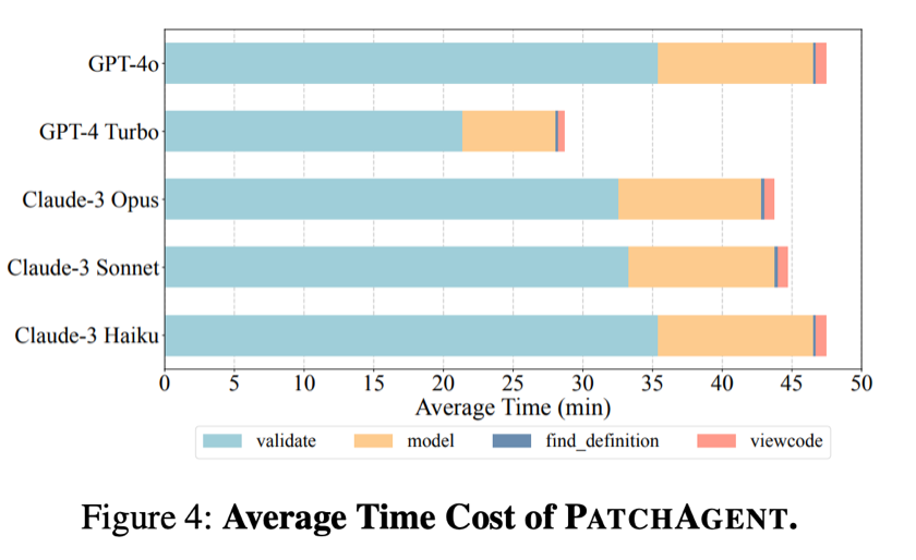 在效率分析方面,作者评估了 PatchAgent 在不同 LLM 模型下的 Token 消耗和时间成本 。如表5所示,Claude-3 Opus 实现了最高的修复成功率(84.83%),但平均每个任务的成本也最高(0.10,但修复率为71.79% 。GPT-4o 和 GPT-4 Turbo 在成本和修复率之间提供了不同的权衡 。时间成本分析(图4)显示,GPT-4 Turbo 的修复速度最快,平均修复时间约为28.7分钟,而其他模型的修复时间约为45分钟 。在所有模型中,“验证(validate)” 步骤占据了大部分时间(74%至82%),其次是与LLM通信的 “模型(model)” 时间(17%至27%) 。