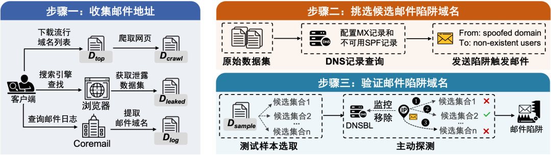 实验方法:攻击者发动黑名单操纵攻击的基本条件是收集到安全机构的邮件陷阱。尽管邮件陷阱和普通电子邮件地址看起来非常相似,但我们发现现实世界中大量邮件陷阱暴露出明显的特征,包括接受向不存在用户发送的、身份验证失败的电子邮件,域名不配置身份验证相关的DNS记录等等。我们提出了一个识别黑名单供应商部署的邮件陷阱的框架,如下图所示。具体来说,我们首先广泛收集域名数据集,然后采用特征过滤获得垃圾邮件陷阱域名候选数据集,最后通过主动验证来识别垃圾邮件陷阱域名。