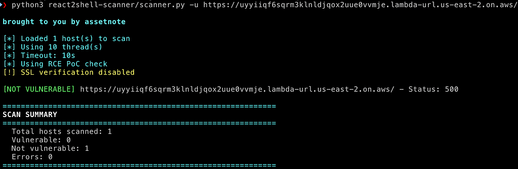 The problem is that Lambda is an edge case that breaks their core assumptions. To illustrate this gap, I ran a popular open-source scanner against a known-vulnerable OpenNext.js deployment. Despite the underlying vulnerability being active, the scanner returned a clean bill of health.