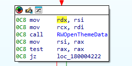 Here we have some code that loads rdx, a volatile register we need to load. It loads it from rsi, which is a register we can load easily: Since rsi is callee-saved, gadgets of the form pop rsi ; ret are abundant. Of course, the trouble is that the most important element is missing: After it loads rdx, instead of returning to the ROP chain, the code calls some other function, RWOpenThemeData. Where does that lead?