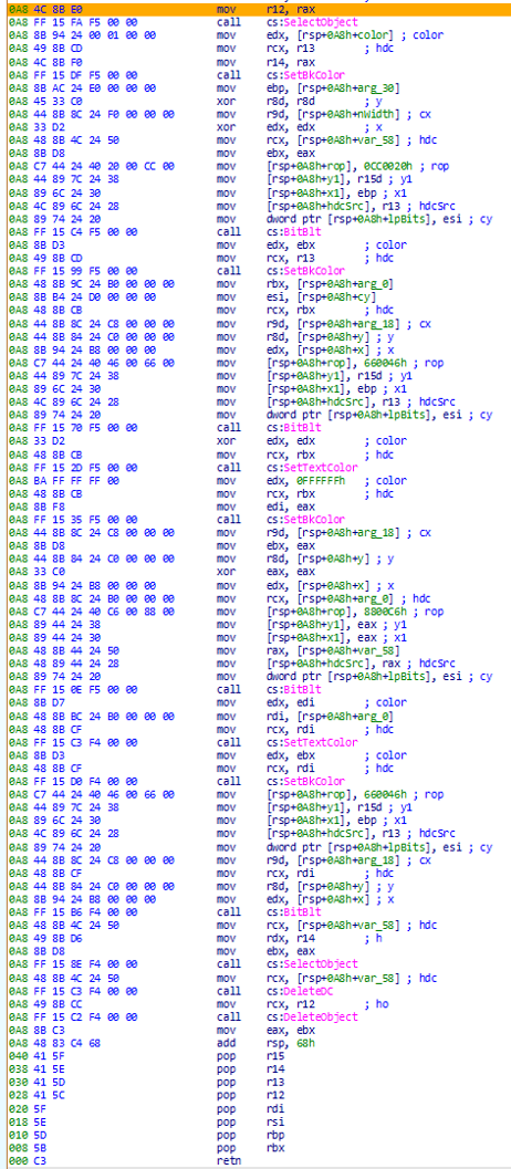 In one respect I was incredibly lucky here. Since the initial value of eax lacked 16-byte alignment (reliably so, it turns out), when transferring this value into rsp and then making numerous GDI calls, those calls could easily have resulted in processor exceptions that would have terminated the process. It was my good fortune that, throughout all those GDI calls, no processor instructions requiring correct 16-byte stack alignment were encountered.