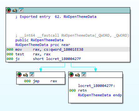 RWOpenThemeData, it turns out, is a wrapper around a call to a function pointer stored at 18001EE38. As part of DllMain initialization, the module populates this function pointer with the address of UXTHEME! OpenThemeData, obtained using a call to GetProcAddress. Unsurprisingly, after initialization, the module leaves the page containing the function pointer in a PAGE_READWRITE state. All told, nothing prevents our ROP chain from overwriting the function pointer at 18001EE38, radically altering the control flow of the code in Figure 3. What should we choose to write into 18001EE38? How about this, our old standby: