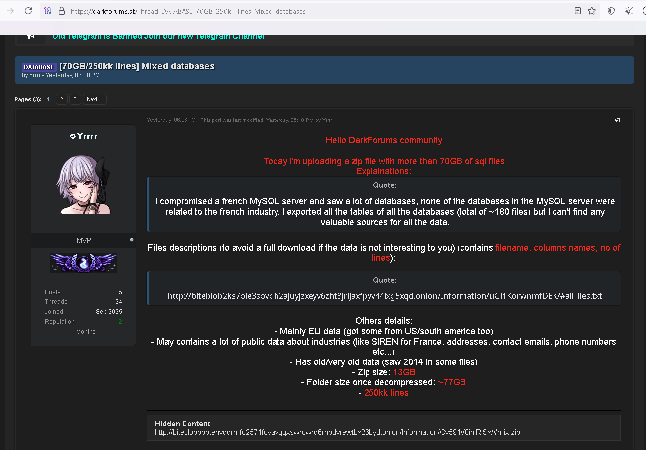 A user on DarkForums claimed in October 2025 to have compromised a French MySQL server, leading to the exposure of over 77GB of SQL database files. The leak includes approximately 180 files with an estimated 250 million lines of data. Despite the French origin of the server, the attacker noted that none of the databases were directly related to the French industry.