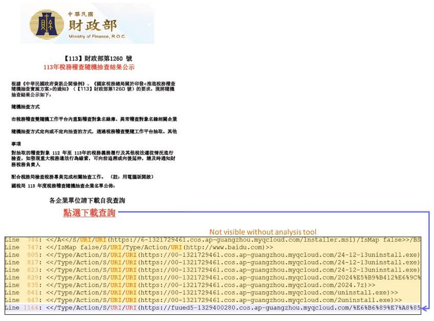 Most malicious links pointed to Tencent Cloud, whose unique account IDs allowed analysts to trace multiple phishing files to the same threat operators. The attackers evolved from using cloud storage links to custom domains containing “tw”, suggesting Taiwan-focused targets. One such PDF masquerading as a Taiwanese tax regulation draft redirected users to a Japanese-language site that delivered a HoldingHands payload, linking both campaigns via a shared C2 IP (156.251.17[.]9) and debug path “BackDoor.pdb.”