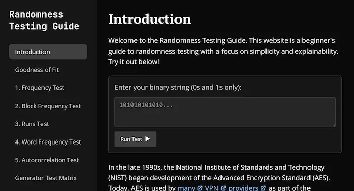 这个网站给出一系列方法,测试某种随机数生成器是否足够随机,所有测试方法都有详细易懂的解释,可以用来学习统计学。