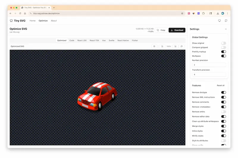 开源的网页版 SVG 压缩,可以在线试用。(@mutou981 投稿)