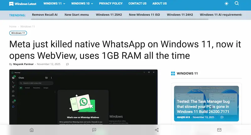 作者震惊地发现,它的新版本居然退回了 WebView,成为网页版的包装器,性能急剧下降,内存占用 1GB。原因可能是 Meta 公司裁掉了 Windows 版的开发团队。