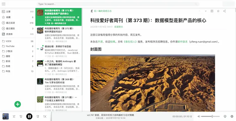 开源 RSS 阅读和 Podcasts 播放网站。(@copilot-is 投稿)