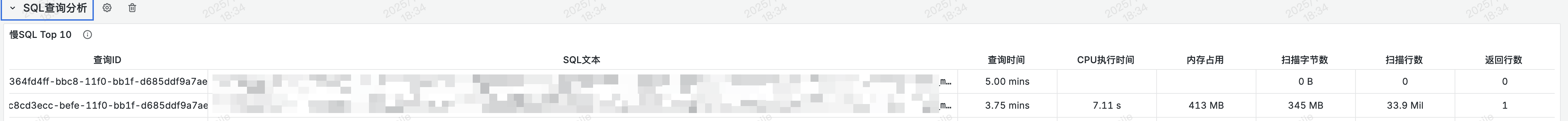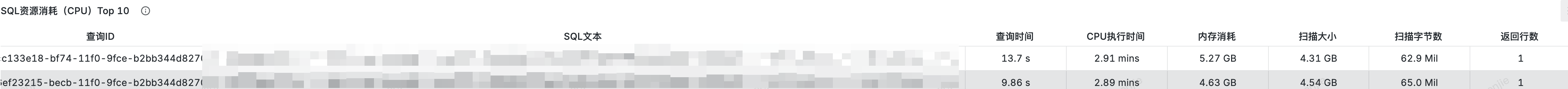 | IsQuery:"true"|SELECT QueryId,Stmt,Time,CpuCostNs,MemCostBytes,ScanBytes,ScanRows,ReturnRows ORDER BY CpuCostNs DESC LIMIT 10