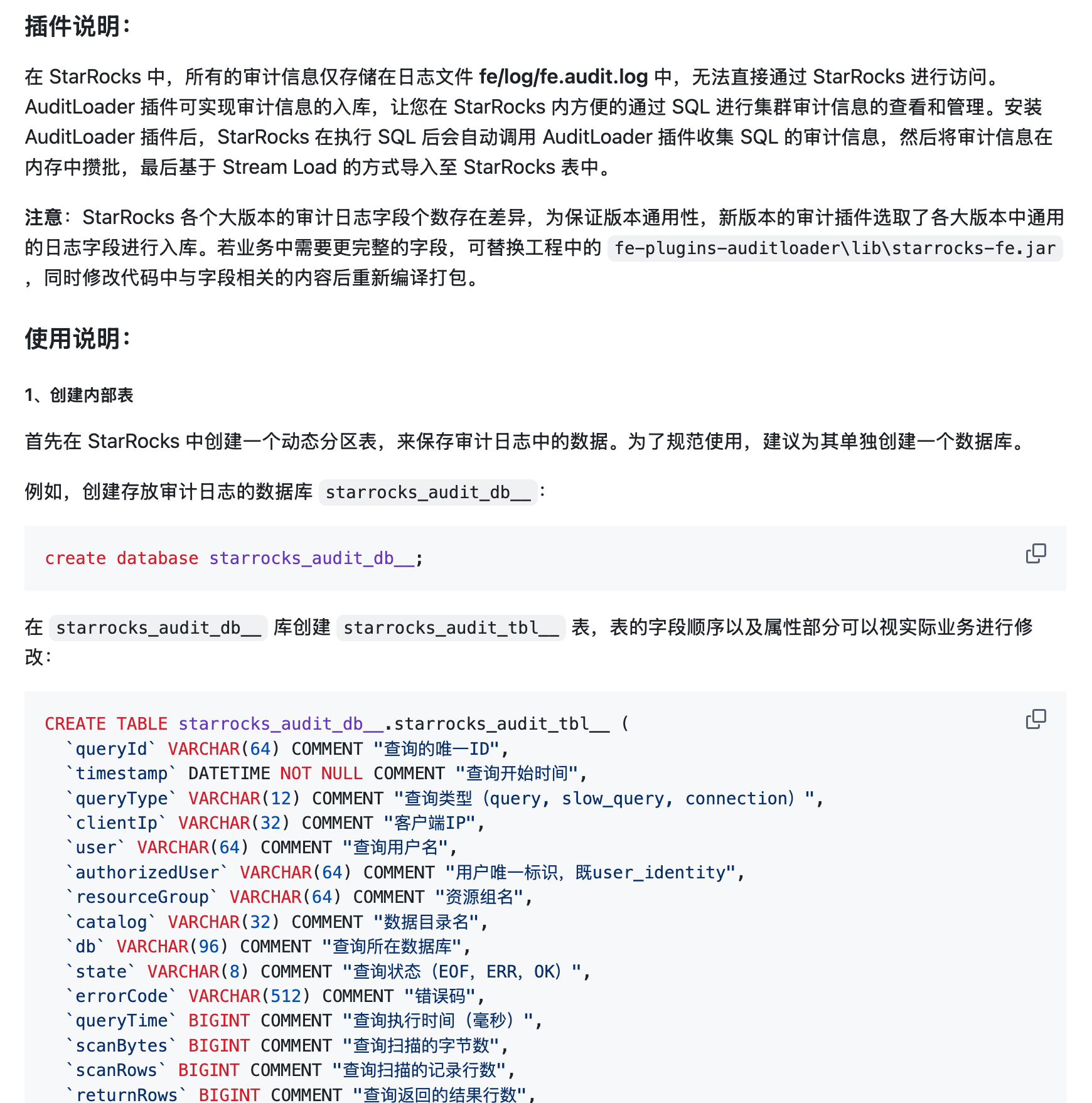 | CREATE TABLE starrocks_audit_db__.starrocks_audit_tbl__ ( `queryId` VARCHAR(64) COMMENT "查询的唯一ID", `timestamp` DATETIME NOT NULL COMMENT "查询开始时间", `queryType` VARCHAR(12) COMMENT "查询类型(query, slow_query, connection)", `clientIp` VARCHAR(32) COMMENT "客户端IP", `user` VARCHAR(64) COMMENT "查询用户名", `authorizedUser` VARCHAR(64) COMMENT "用户唯一标识,既user_identity", `resourceGroup` VARCHAR(64) COMMENT "资源组名", `catalog` VARCHAR(32) COMMENT "数据目录名", `db` VARCHAR(96) COMMENT "查询所在数据库", `state` VARCHAR(8) COMMENT "查询状态(EOF,ERR,OK)", `errorCode` VARCHAR(512) COMMENT "错误码", `queryTime` BIGINT COMMENT "查询执行时间(毫秒)", `scanBytes` BIGINT COMMENT "查询扫描的字节数", `scanRows` BIGINT COMMENT "查询扫描的记录行数", `returnRows` BIGINT COMMENT "查询返回的结果行数", `cpuCostNs` BIGINT COMMENT "查询CPU耗时(纳秒)", `memCostBytes` BIGINT COMMENT "查询消耗内存(字节)", `stmtId` INT COMMENT "SQL语句增量ID", `isQuery` TINYINT COMMENT "SQL是否为查询(1或0)", `feIp` VARCHAR(128) COMMENT "执行该语句的FE IP", `stmt` VARCHAR(1048576) COMMENT "SQL原始语句", `digest` VARCHAR(32) COMMENT "慢SQL指纹", `planCpuCosts` DOUBLE COMMENT "查询规划阶段CPU占用(纳秒)", `planMemCosts` DOUBLE COMMENT "查询规划阶段内存占用(字节)", `pendingTimeMs` BIGINT COMMENT "查询在队列中等待的时间(毫秒)", `candidateMVs` varchar(65533) NULL COMMENT "候选MV列表", `hitMvs` varchar(65533) NULL COMMENT "命中MV列表", `warehouse` VARCHAR(128) NULL COMMENT "仓库名称" )