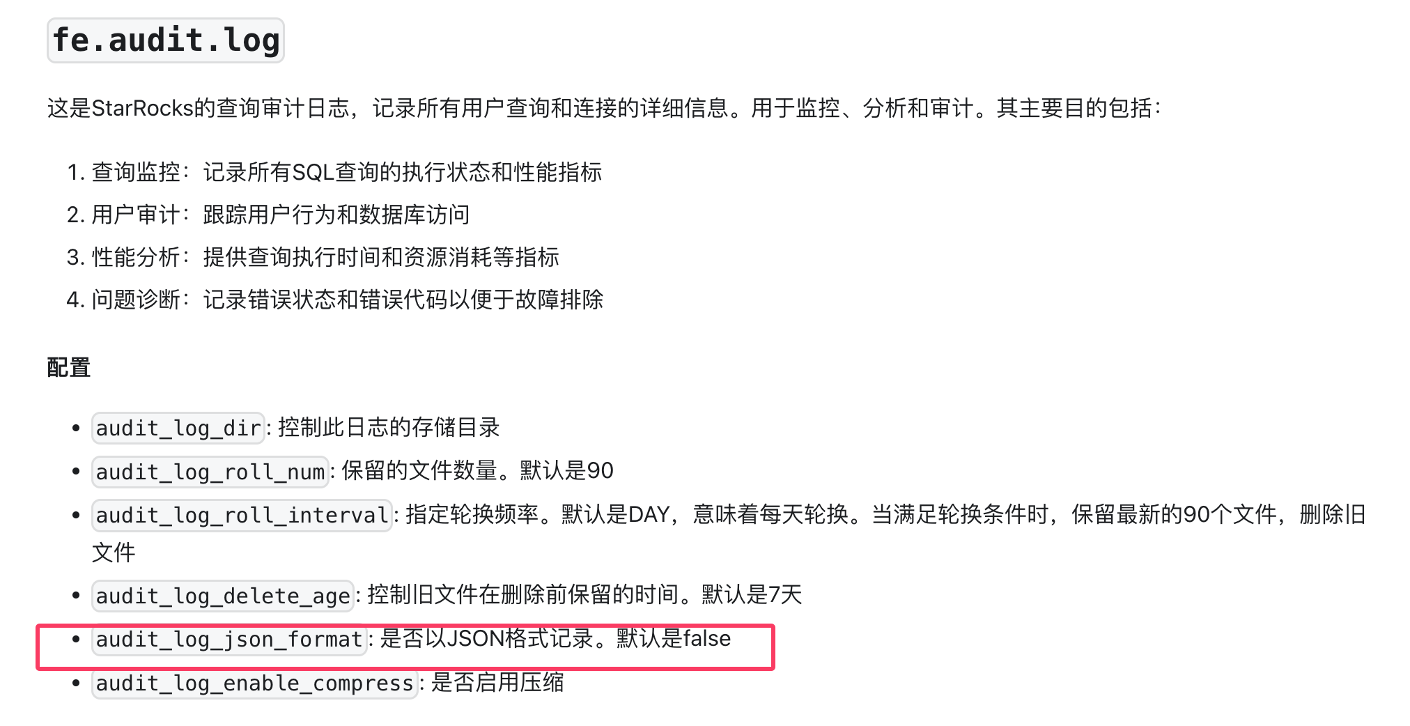 在 StarRocks 中审计日志记录了所有用户的查询和连接信息,理论上我们只需要对这些日志进行分析就可以得到相关的慢 SQL,高 CPU、高内存的 SQL 信息。