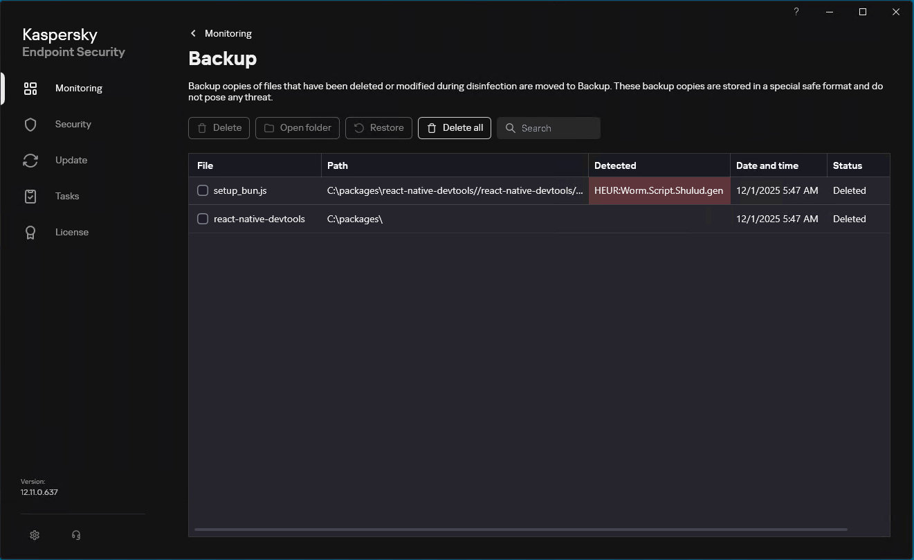We continue tracking this malicious activity and provide up-to-date information to our customers via the Kaspersky Open Source Software Threats Data Feed. The feed includes all packages affected by Shai-Hulud, as well as information on other open-source components that exhibit malicious behaviour, contain backdoors, or include undeclared capabilities.