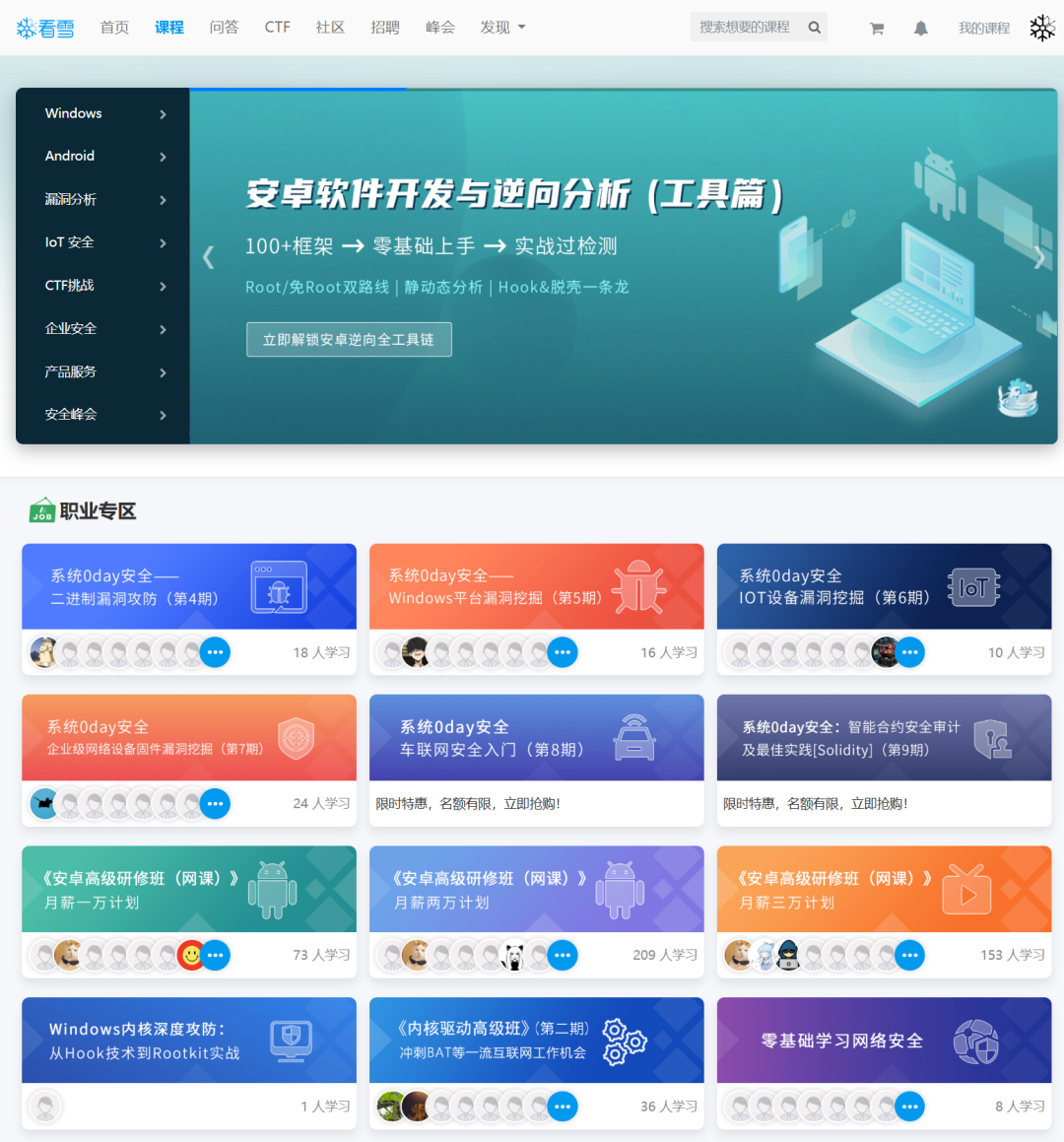 看雪课程涵盖普通课、体系课、直播课三大类型,难度覆盖入门到高级,全面覆盖Windows、Android、漏洞挖掘、安全编程、IoT安全、CTF、企业安全等多个细分领域。针对求职需求设置的“职业专区”课程,聚焦企业实际岗位技能要求,助力学员快速适配职场。