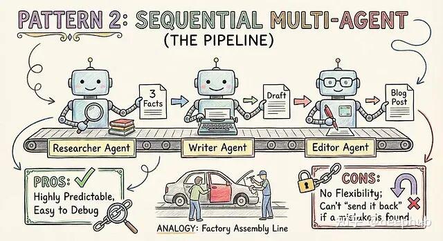实际案例:博客生成流水线。研究员智能体找素材,写作智能体出草稿,编辑智能体查语法,三步串行。