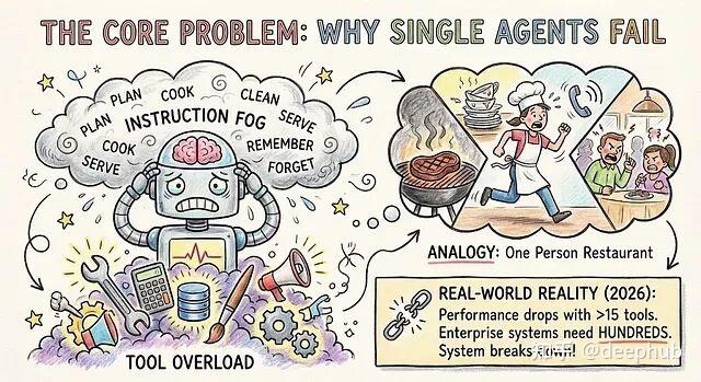 单智能体失效的核心原因有两个:第一是"指令迷雾",提示词一长模型就开始丢指令;第二是"工具过载",可选工具太多时,模型的选择准确率急剧下降。