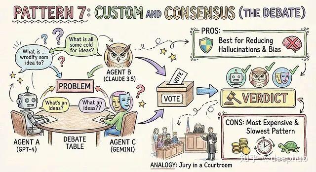 多个不同"人设"或底层模型的智能体(比如 GPT-4 和 Claude 3.5)独立求解同一问题,然后投票或辩论,选出最可能正确的答案。这是减少幻觉和偏见的效果最好的方法,但也是最贵的。