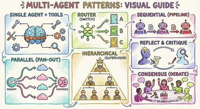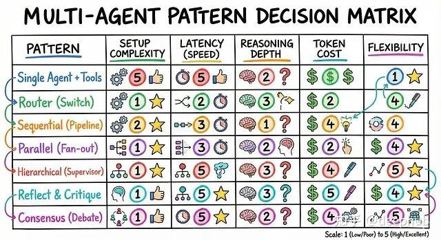 设计多智能体系统更像管理团队,而不是写代码。先用单智能体跑起来。如果工具太多扛不住了,就改路由模式。任务复杂、步骤多,上顺序或层级架构。要追求完美输出,加反思循环。