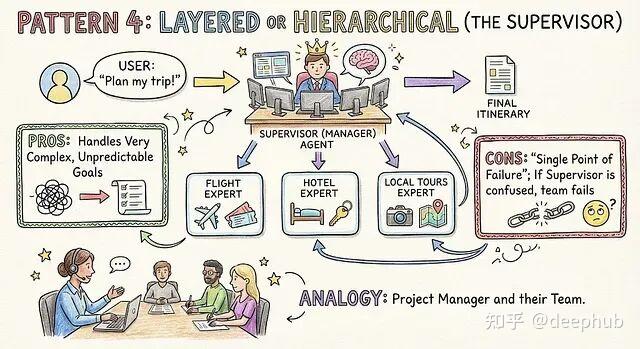 顶层有个"经理"智能体,不干具体活儿,只负责拆解任务、分配给下面的"工人"智能体。
