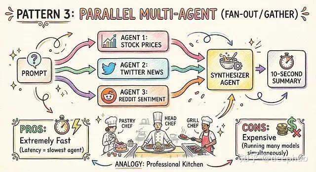 应用场景:市场分析系统。一个智能体抓股价、一个盯推特、一个扫 Reddit 情绪,并行跑完 10 秒出报告。