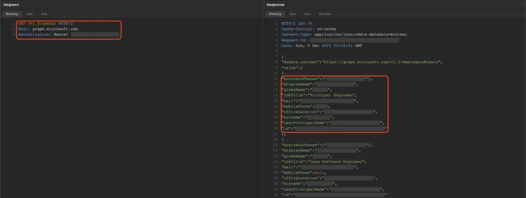 The attacker discovers the verbose error condition and extracts a valid Microsoft Graph OAuth token. This provides immediate, authenticated access to the organization’s Microsoft 365 environment without triggering typical failed authentication alerts.