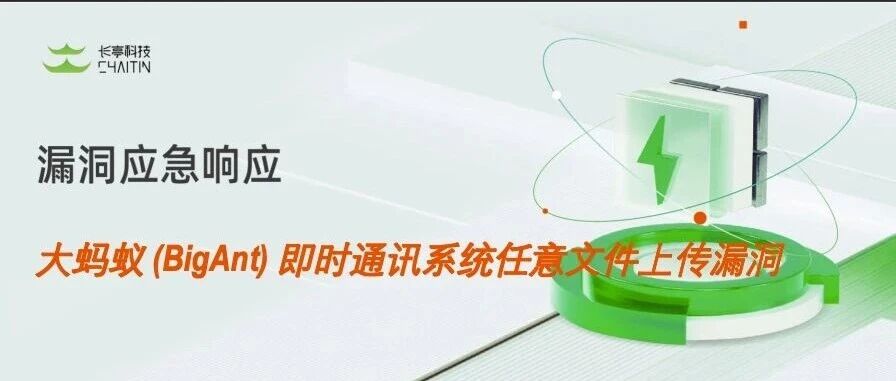 2026年1月,长亭安全应急响应中心监测到大蚂蚁即时通讯系统发布补丁修复了一处前台任意文件上传漏洞。未经身份验证的攻击者可利用该漏洞上传恶意脚本文件,获取服务器控制权限,利用难度较低,建议受影响的用户尽快修复。