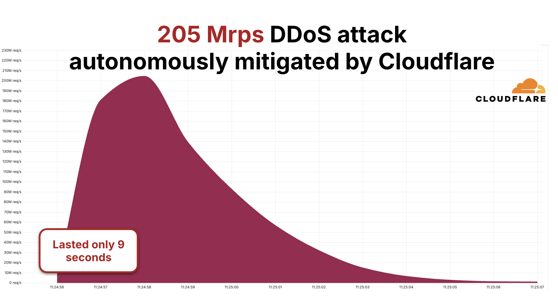 As the number of attacks increased over the course of 2025, the size of the attacks increased as well, growing by over 700% compared to the large attacks seen in late 2024, with one reaching 31.4 Tbps in a DDoS attack that lasted just 35 seconds. The graph below portrays the rapid growth in DDoS attack sizes as seen and blocked by Cloudflare — each one a world record, i.e. the largest ever disclosed publicly by any company at the time.
