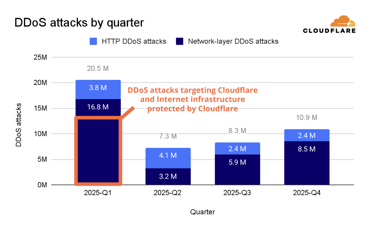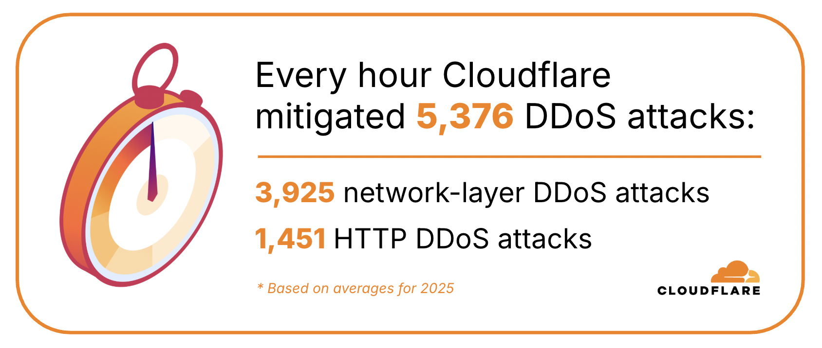 In 2025, Cloudflare mitigated an average of 5,376 DDoS attacks every hour — of these, 3,925 were network-layer DDoS attacks and 1,451 were HTTP DDoS attacks.