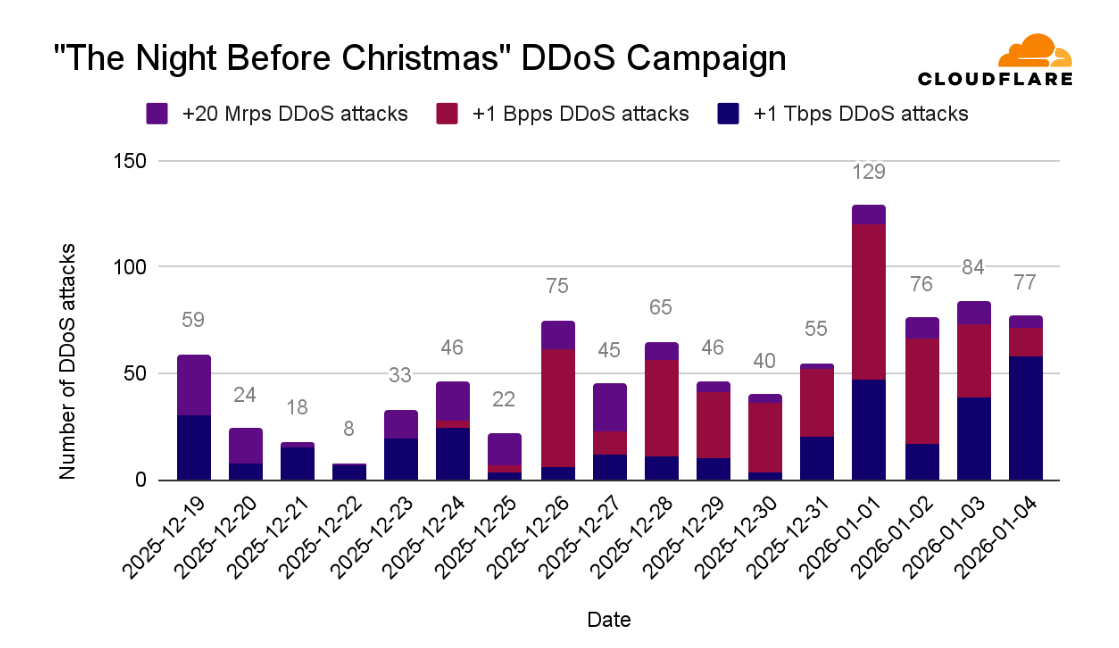The fourth quarter of 2025 was characterized by an unprecedented bombardment launched by the Aisuru-Kimwolf botnet, dubbed “The Night Before Christmas" DDoS attack campaign. The campaign targeted Cloudflare customers as well as Cloudflare’s dashboard and infrastructure with hyper-volumetric HTTP DDoS attacks exceeding rates of 200 million requests per second (rps), just weeks after a record-breaking 31.4 Terabits per second (Tbps) attack.